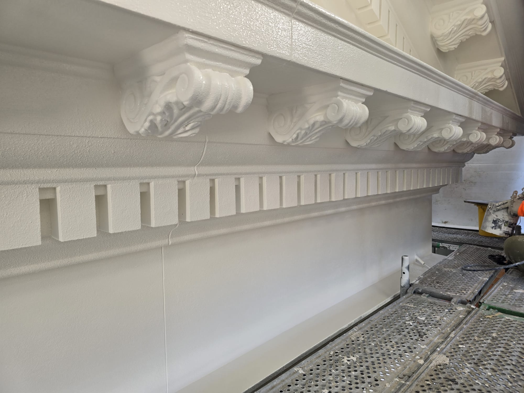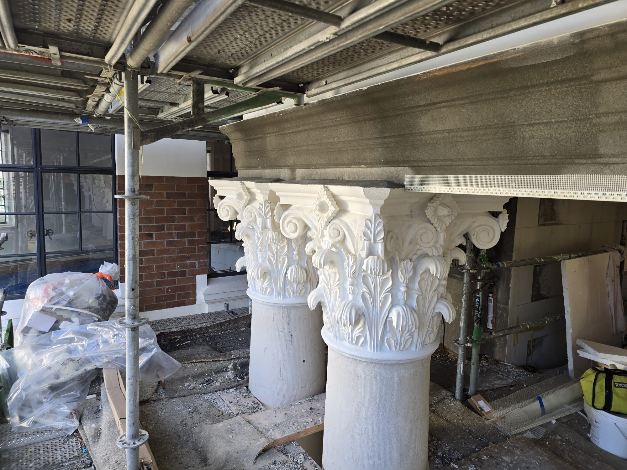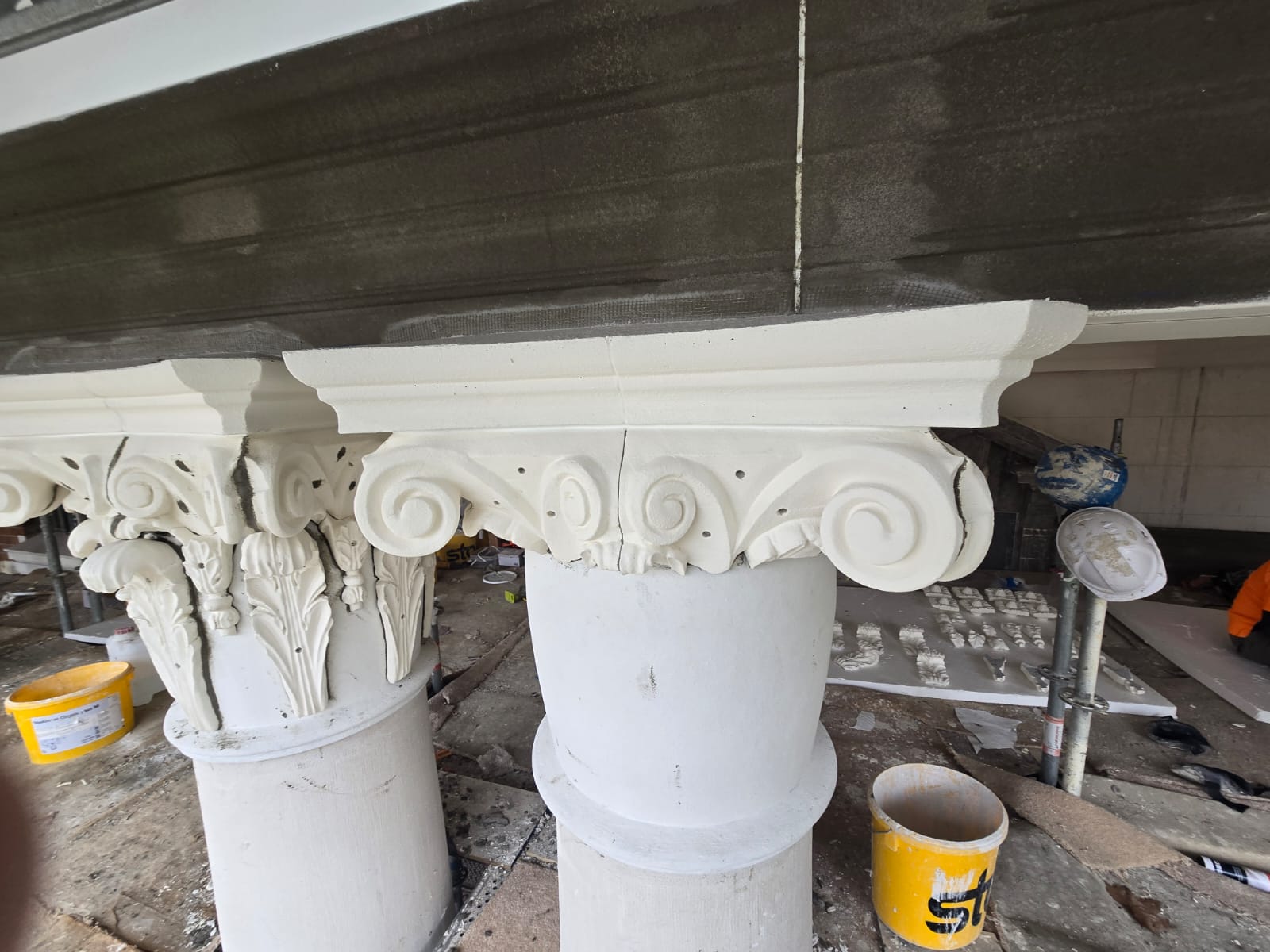 Reinstatement of the portico was undertaken utilising an integrated structural steel portal frame to provide seismic stiffening in conjunction with contemporary building materials including the Sto Armour Façade Panel Cladding System, Accumen mouldings and the Sto Armat Render System with StoLit MP Finishing Texture.
