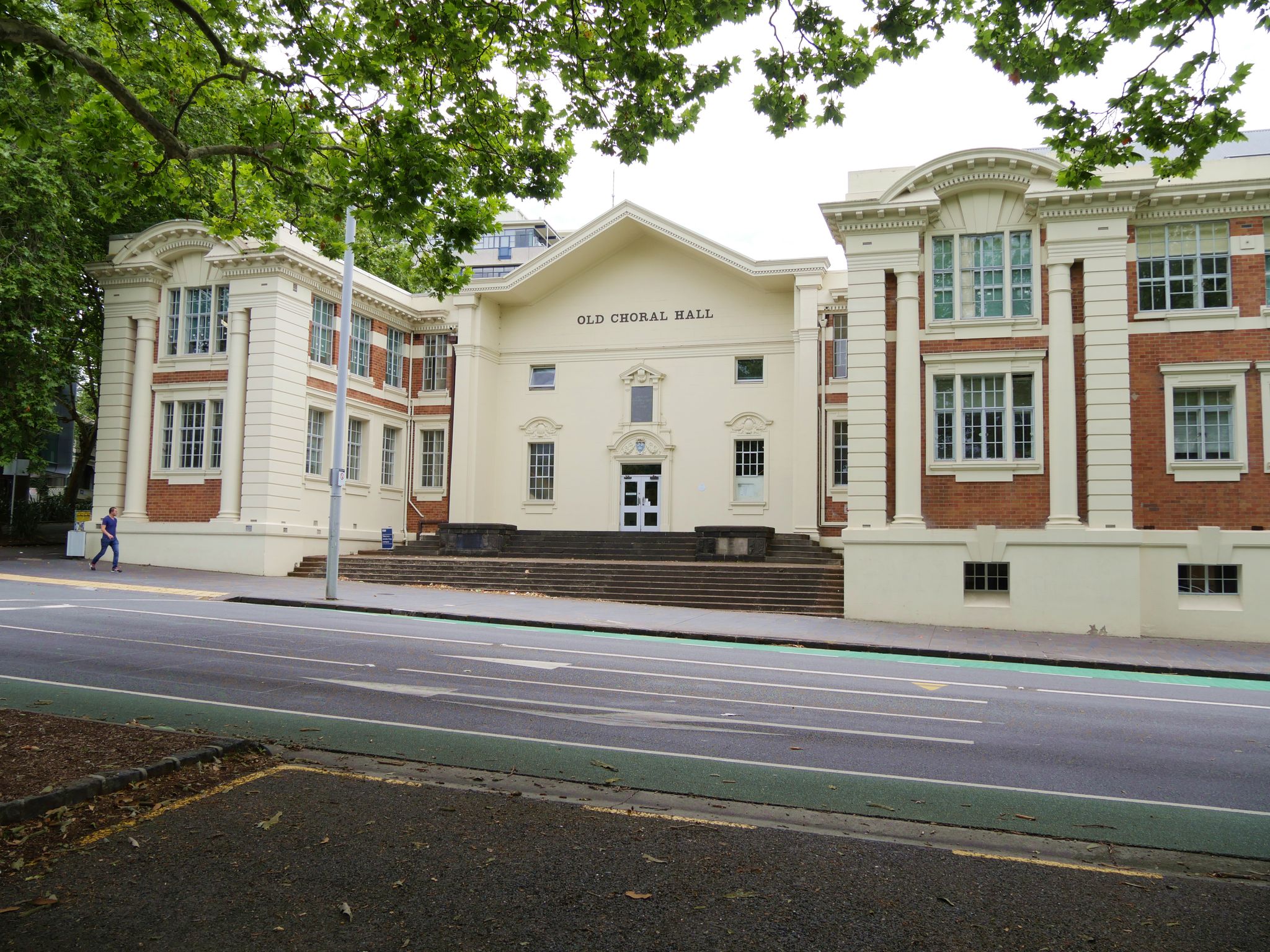 The Neo-Classical Old Choral Hall was the third performance venue built by the Auckland Choral Society after the previous two buildings were destroyed by arson. The masonry portico feature and the eight towering support columns were removed after the 1932 Napier earthquake out of concern for its structural integrity as it was seen as a potential collapse risk – resulting in the ‘incomplete’ appearance of the building.